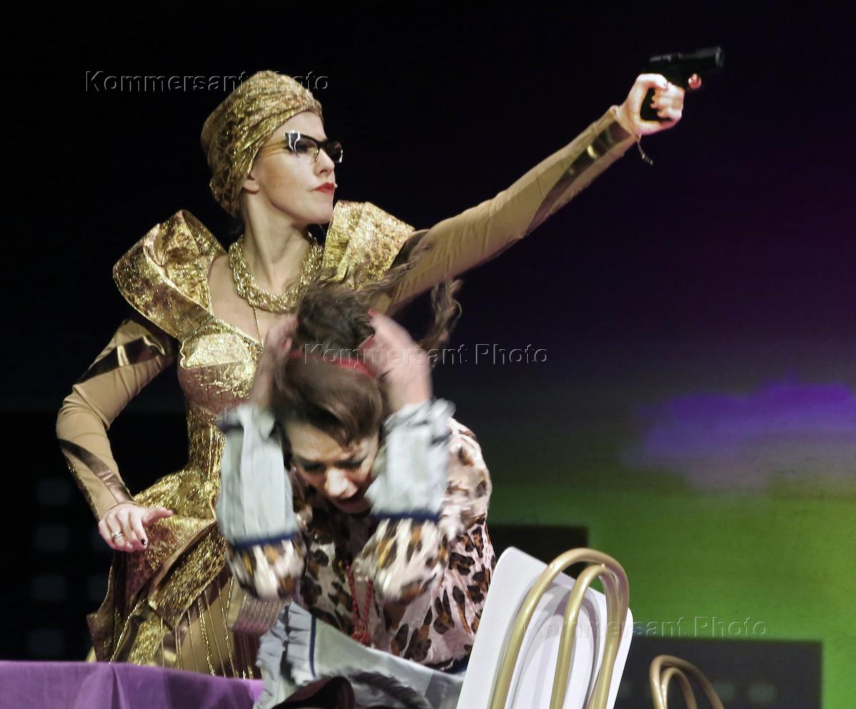 Спектакль "Женитьба", режиссера Филиппа Григорьяна прошел на сцене театра "Наций". Актриса Анна Уколова (слева) и телеведущая Ксения Собчак (справа) во время спектакля.