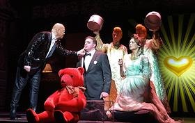 Спектакль "Женитьба", режиссера Филиппа Григорьяна прошел на сцене театра "Наций". Актер Максим Виторган (второй слева) и актриса Анна Уколова (справа) во время спектакля.