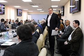 Председатель Совета при президенте России по развитию гражданского общества и правам человека Михаил Федотов (слева) и экономист, научный руководитель Государственного Университета "Высшая школа экономики" Евгений Ясин (справа) во время заседания "круглого стола" на тему "Возрождение интитута следственных судей в России: идеи и пути реализации". Заседание прошло в офисном центре "Троицкий".