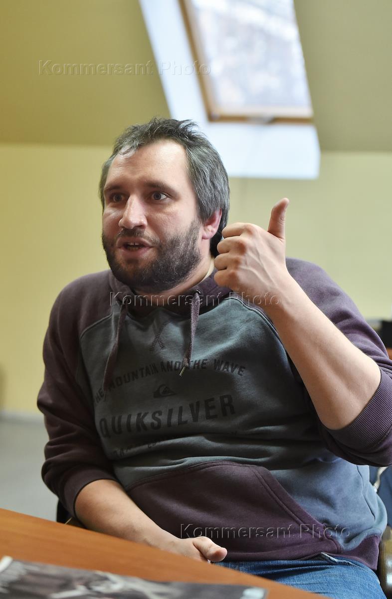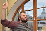 Жанровая фотография. Рабочие вещают рекламный плакат в витрину офиса компании по экспресс-займам "Ваши Деньги".