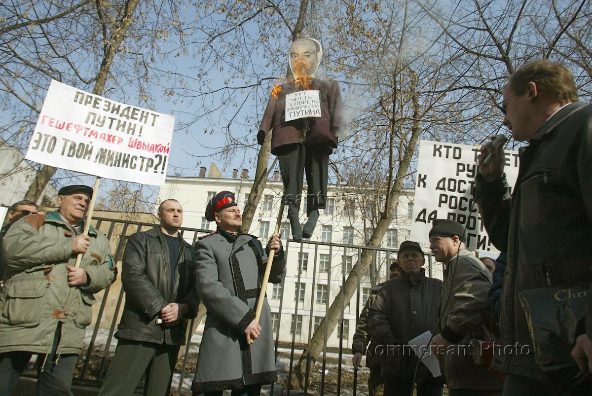Activists of the far-right National-Imperial Party (NDPR) of Russia set on fire an effigy of Russian Culture Minister Mikhail Shvydkoy, blamed by the NDPR for 'saundering Russian national property'. The rally was held in front of the Russian Culture Ministry.
