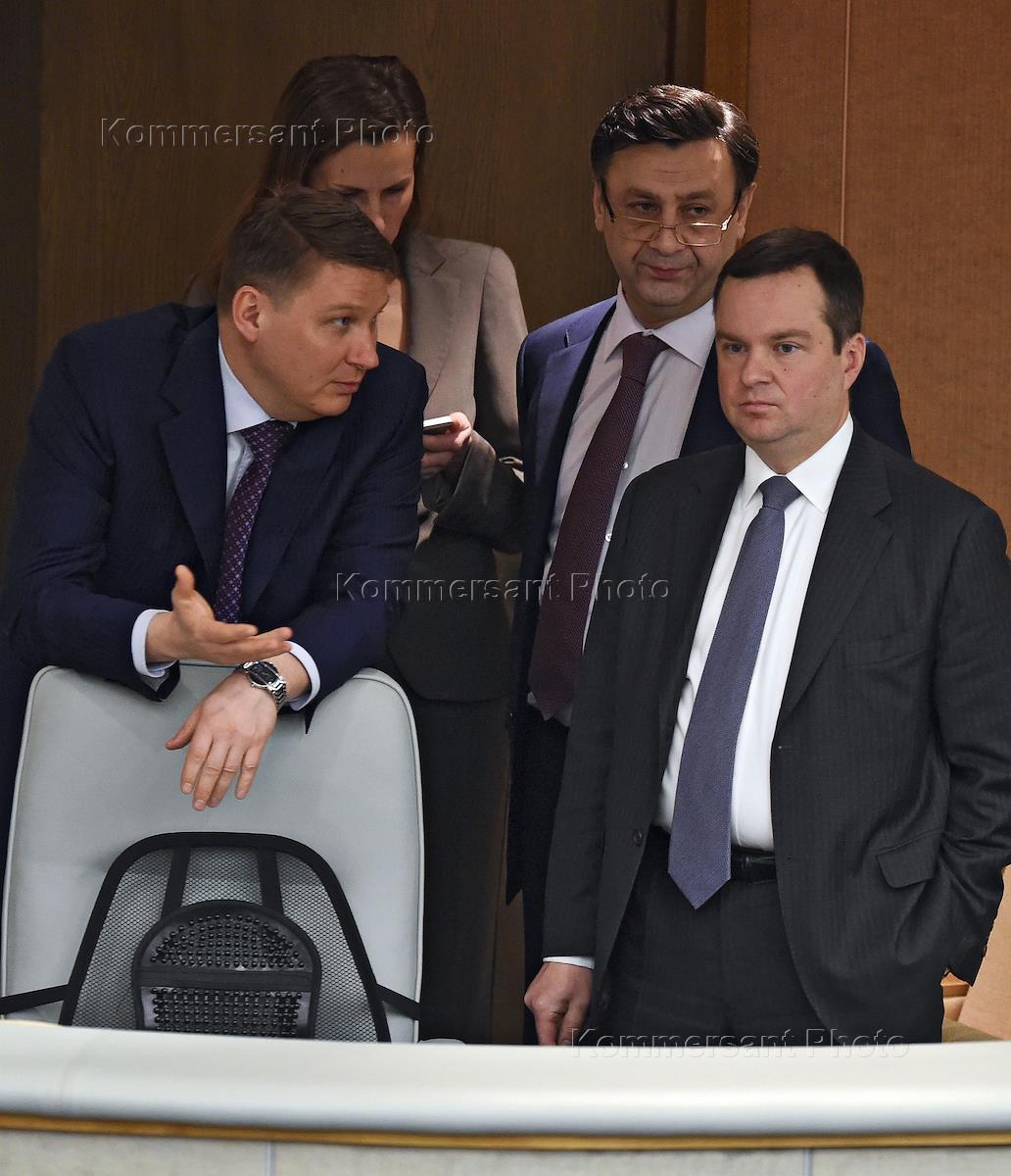 Полномочный представитель правительства России в Государственной думе России Александр Синенко (слева) и заместитель министра финансов России Алексей Моисеев (справа) во время заседания Госдумы.
