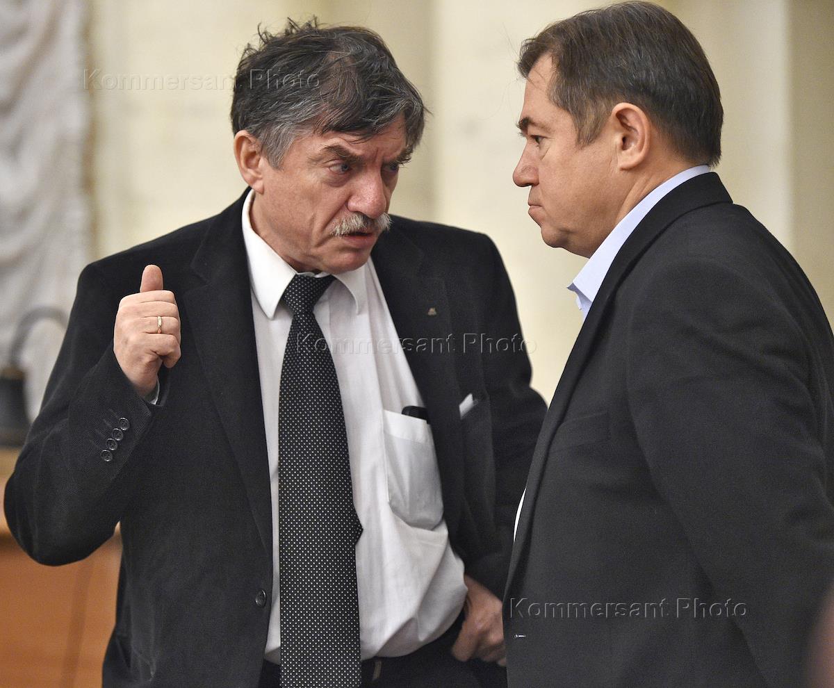 Заместитель председателя коллегии Военно-промышленной комиссии (ВПК) при президенте России Олег Бочкарев (в центре) и руководитель Федерального агентства научных организаций (ФАНО) Михаил Котюков (справа) перед началом заседания президиума Российской академии наук (РАН), посвященного работе оборонно-промышленный комплекс (ОПК) в условиях санкций.
