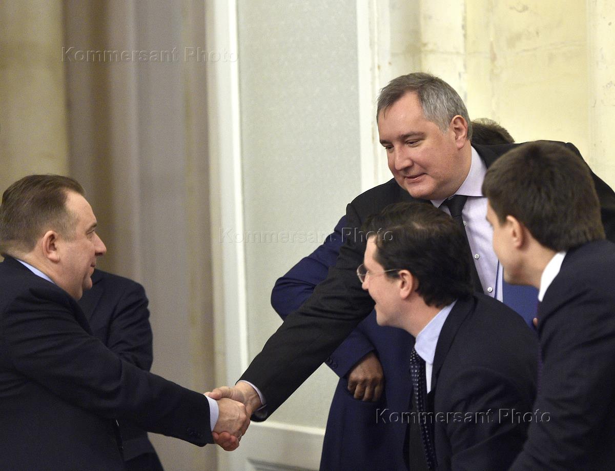 Слева направо: заместитель председателя коллегии Военно-промышленной комиссии (ВПК) при президенте России Олег Бочкарев, президент Российской академии наук (РАН) Владимир Фортов и заместитель председателя правительства России Дмитрий Рогозин на заседании президиума РАН, посвященного работе оборонно-промышленный комплекс (ОПК) в условиях санкций.