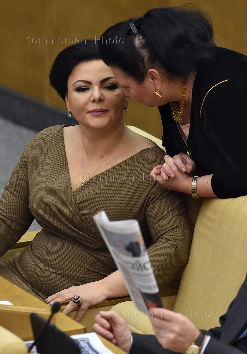 Первый заместитель председателя комитета Государственной думы (ГД) России по жилищной политике и жилищно-коммунальному хозяйству Елена Николаева (слева) и член комитета ГД России по бюджету и налогам Раиса Кармазина (справа) на пленарном заседании Госдумы России.