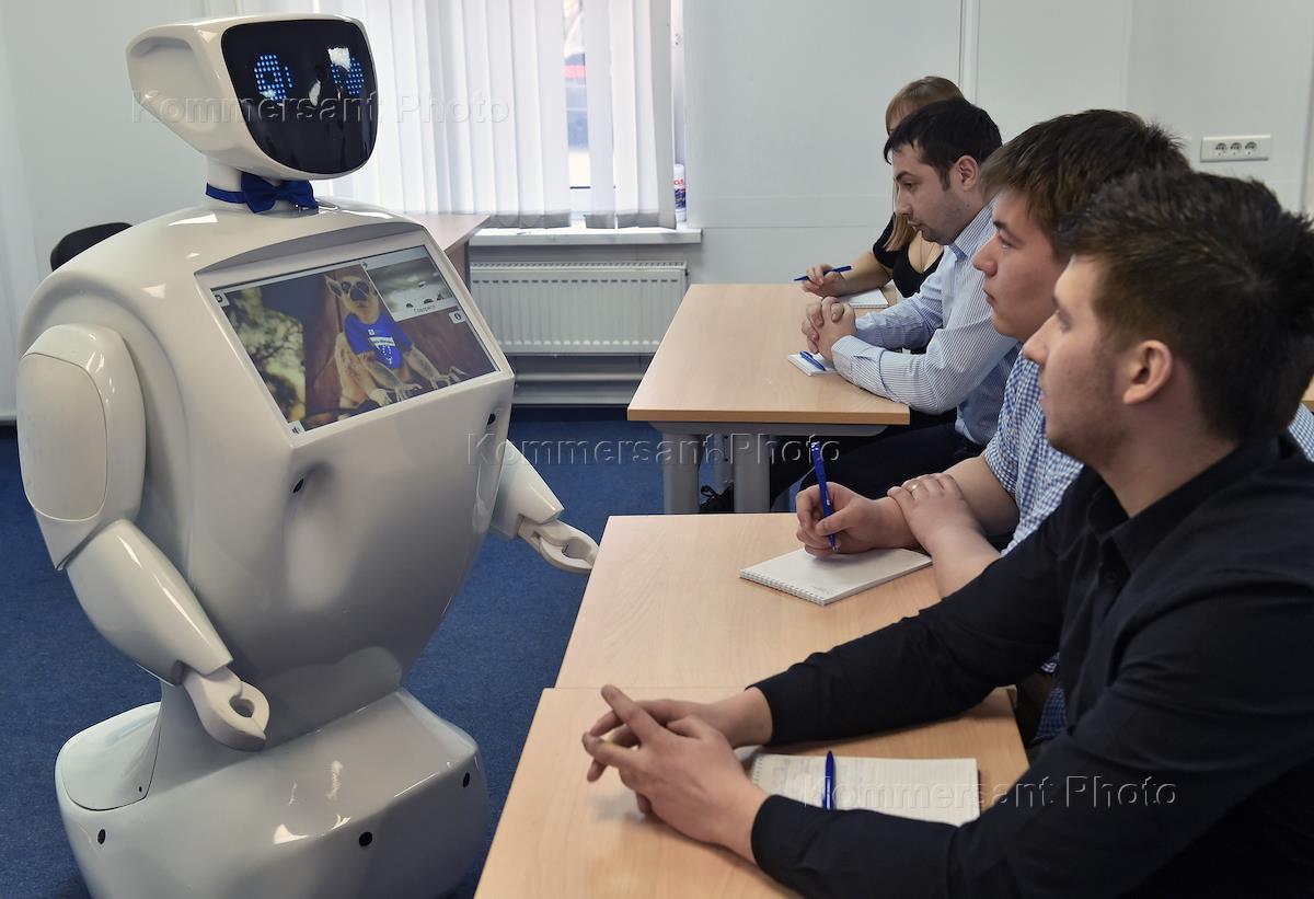 Заместитель председателя Комитета Государственной думы (ГД) России по образованию Олег Смолин (слева) во время презентация российского робота "Алантима", который был разработан пермскими инженерами. Презентация прошла Московский технологический институт (МТИ).