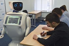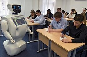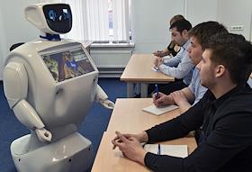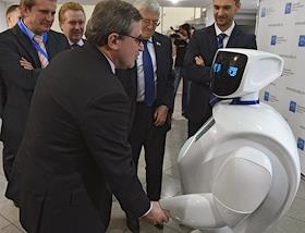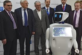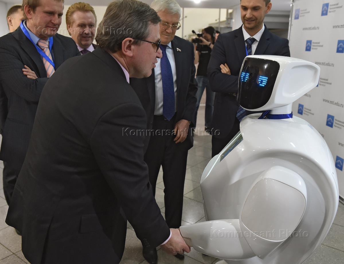 Заместитель председателя Комитета Государственной думы (ГД) России по образованию Олег Смолин (в центре) во время презентация российского робота "Алантима", который был разработан пермскими инженерами. Презентация прошла Московский технологический институт (МТИ).