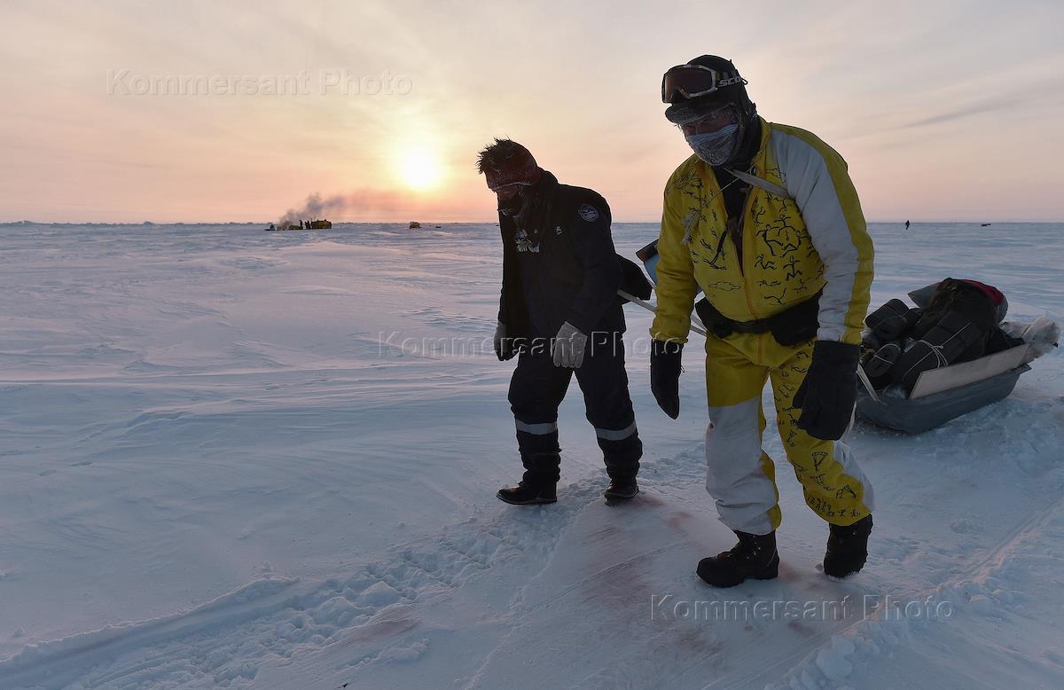 Участники комплексной высокоширотной арктической экспедиция на полярную станцию Купол на Северном полюсе во время работ по транспортировки грузов для станции.