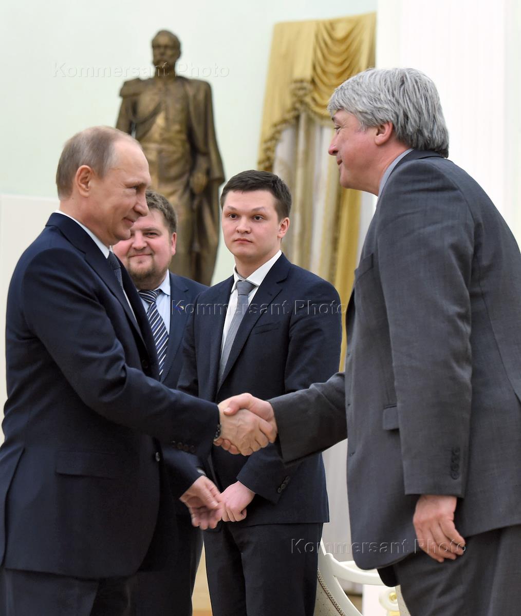 Встреча с президентом организации WorldSkills International (WSI) Саймоном Бартли. Слева направо: президент Республики Татарстан Рустам Минниханов, заместитель председателя правительства России Ольга Голодец и президент России Владимир Путин во время встречи в рамках инспекционной поездки комиссии международного движения WSI для определения готовности России к проведению мирового чемпионата WorldSkills Competition в 2019 году. Встреча прошла в Кремле.