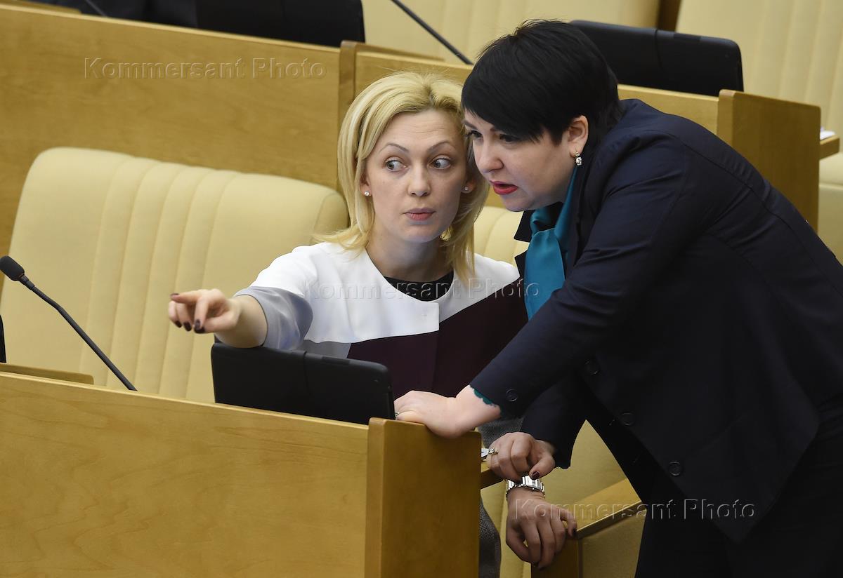 Член комитета Государственной думы (ГД) России по информационной политике, информационным технологиям и связи Ольга Тимофеева (слева) и член Комитета ГД по делам общественных объединений и религиозных организаций Ирина Гусева (справа) на заседании Госдумы.