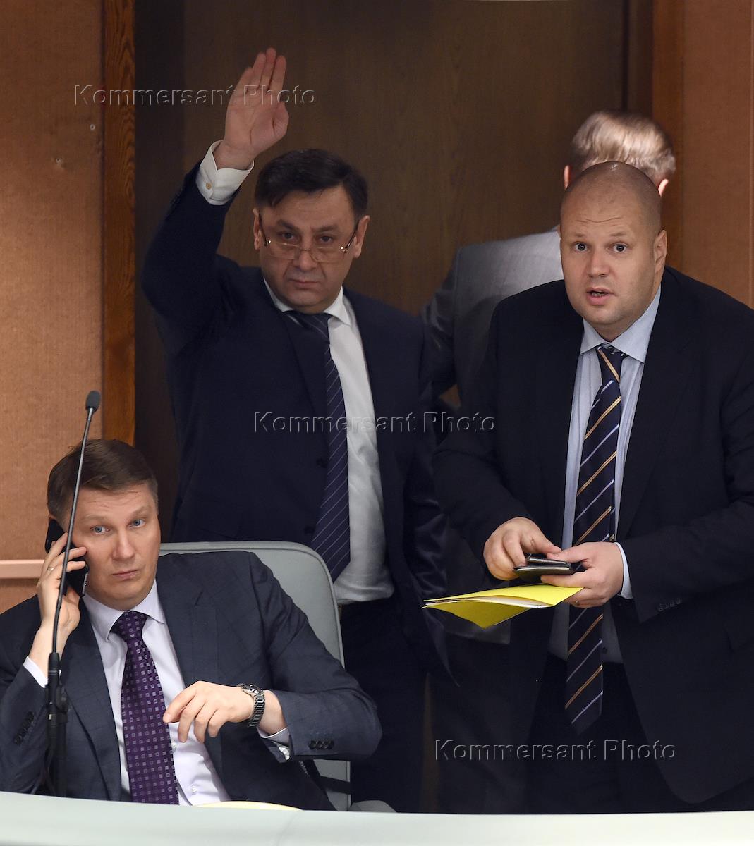 Полномочный представитель правительства России в Государственной думе России Александр Синенко (второй слева) и заместитель министра экономического развития России Алексей Лихачев (в центре) на заседании Госдумы России.