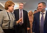 Представитель в Совете Федерации от исполнительного органа государственной власти Ростовской области Евгений Бушмин (слева), председатель Совета Федерации Валентина Матвиенко (справа), председатель Совета министров Республики Крым Сергей Аксенов (в центре) на заседании Совета Федерации России.