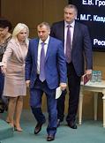 Председатель Совета министров Республики Крым Сергей Аксенов (слева) и председатель Госсовета Республики Крым Владимир Константинов (в центре) на заседании Совета Федерации России.