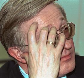 Head of the Duma’s banking committee Alexander Shokhin listens questions during a news conference hosted by Interfax agency.