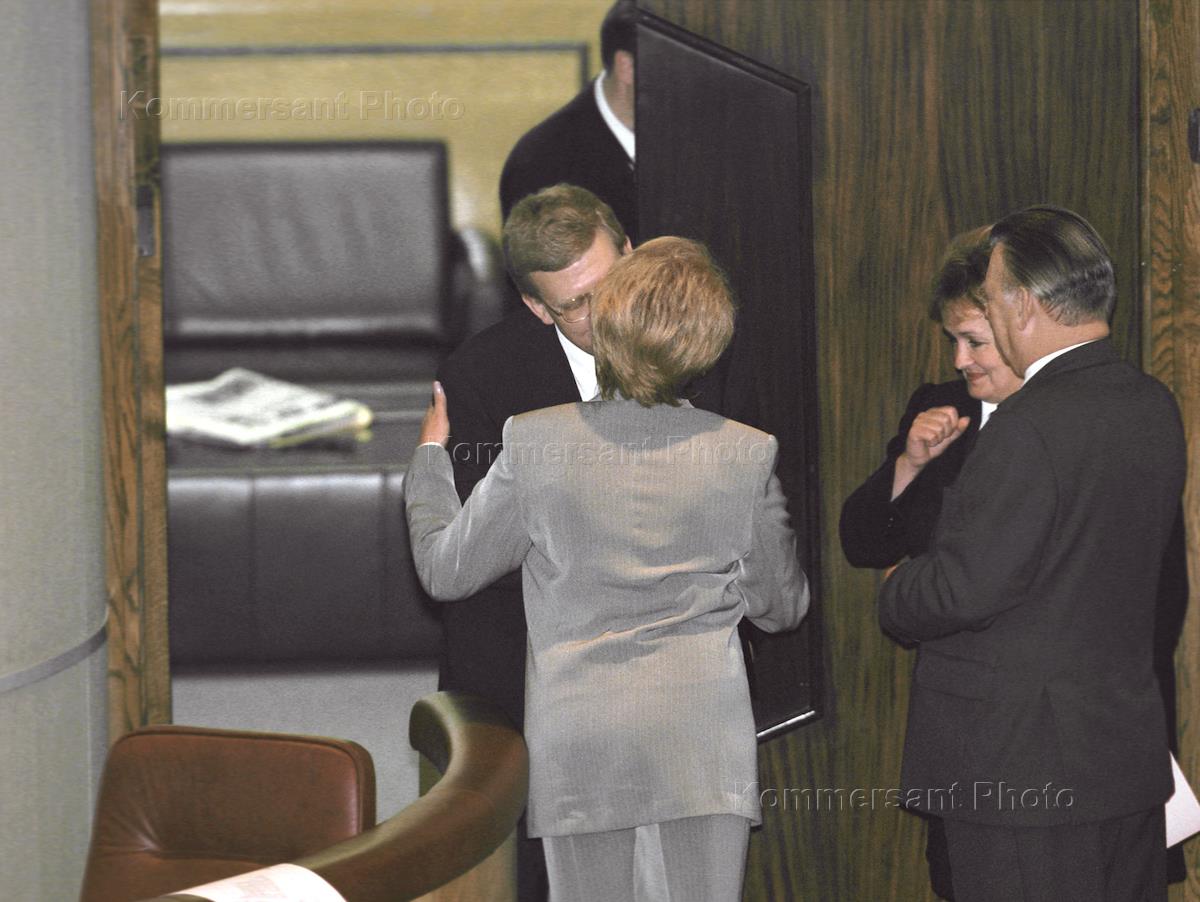 Russian Deputy Prime Minister, Finance Minister Alexey Kudrin (left) and State Duma Vice Speaker Lyubov Sliska (second from the right) embrace each other at a session of the legislature.