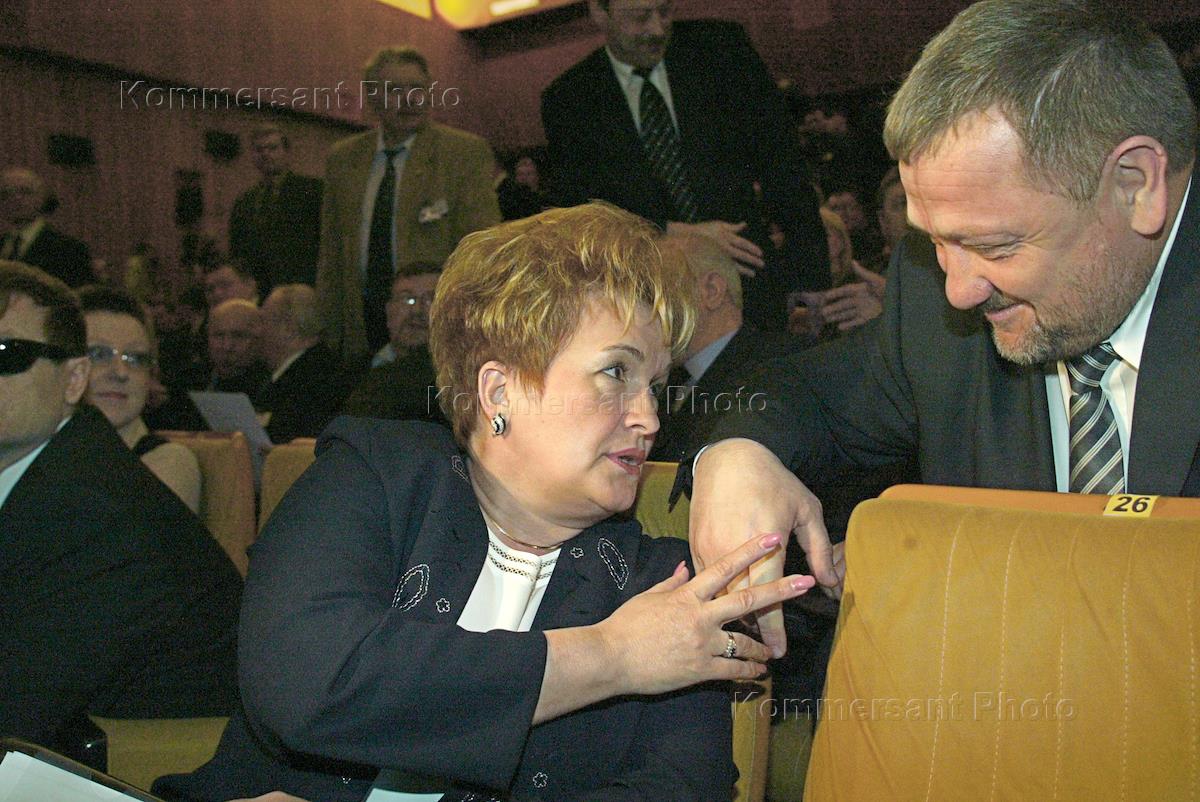 Vice Speaker of the State Duma Lyubov Sliska (centre) greets head of the Chechen Republic transitional administration Ahmad Kadyrov (right) at the 'Russia United' party congress. THe congress was held in the Kosmos Hotel.