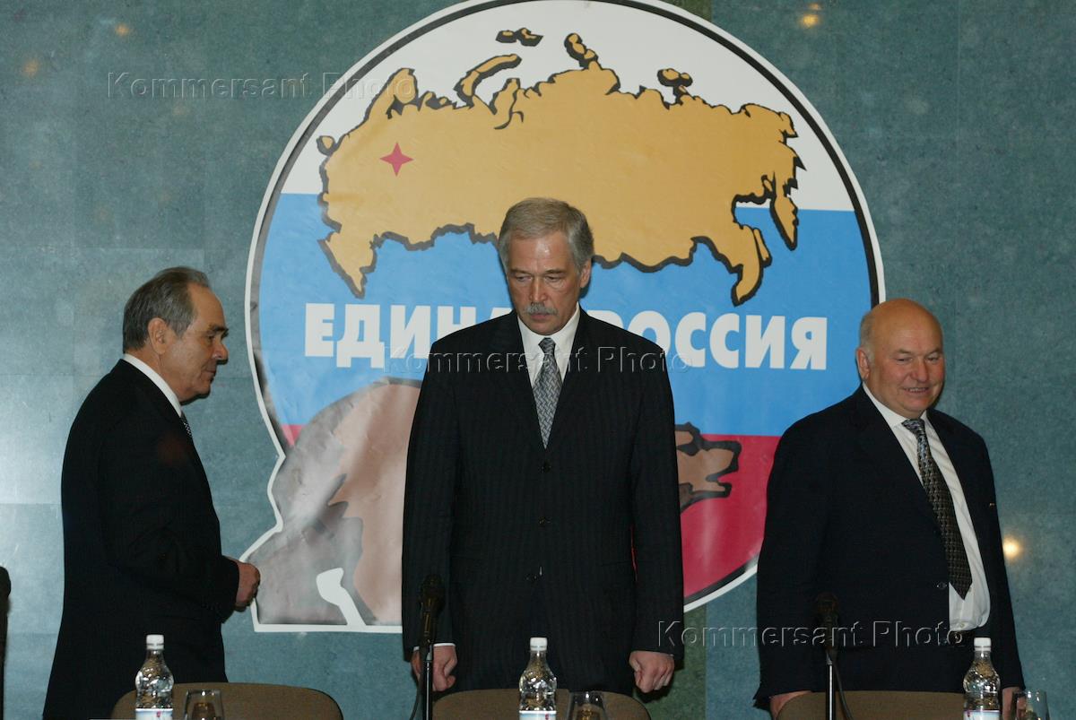 Members of the pro-Kremlin 'United Russia' party supreme political board Interior Affairs Minister Boris Gryzlov (in the centre), Moscow Mayor Yury Luzhkov (to the right) and Tatarstan Republic President Mintimer Shaymiyev (left) take part in a party congress. The event took place in the Rossiya Concert Hall.