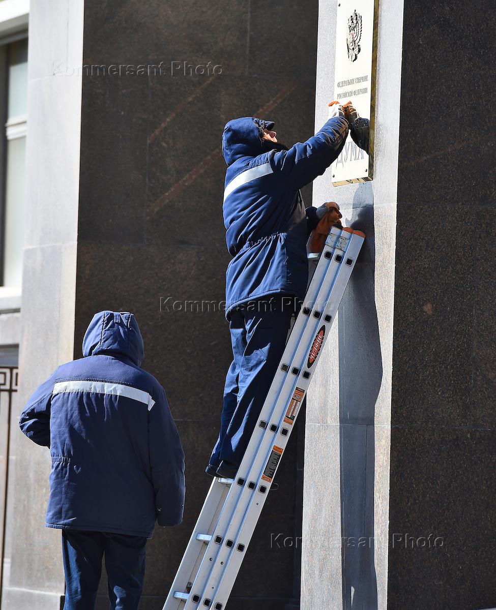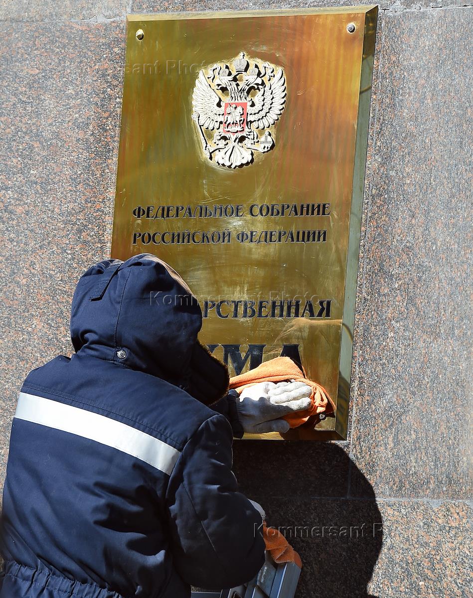Жанровая фотография. Сотрудник технических служб моет табличку на фасаде Государственной думы России.