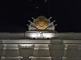 Виды вечернего Симферополя. Герб Республики Крым на фасаде здания Совета министров Республики Крым.