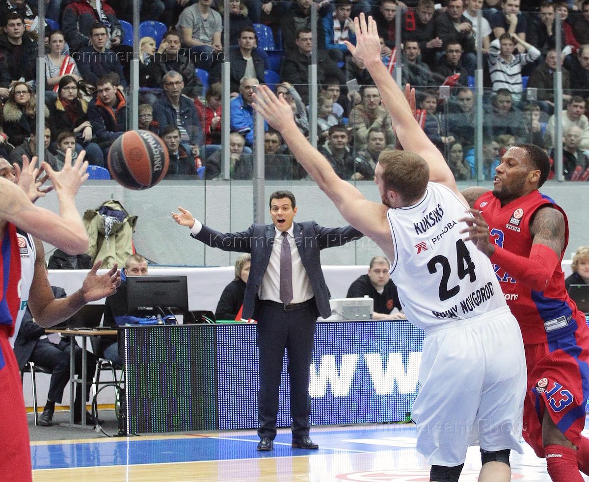 Euroleague on basketball. Match between teams 'Nizhny Novgorod' (Nozhny Novgorod) and CSKA (Moscow). Chief coach of the CSKA team Dimitris Utudis (in the centre) is during the match.