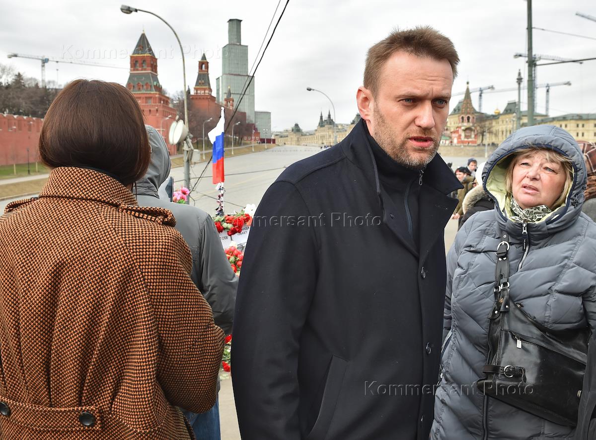 Председатель партии "Партия прогресса" Алексей Навальный на месте гибели сопредседателя политической партии "РПР-ПАРНАС" Борисе Немцове, который был застрелен в ночь с 27 на 28 февраля на Большом Москворецком мосту.
