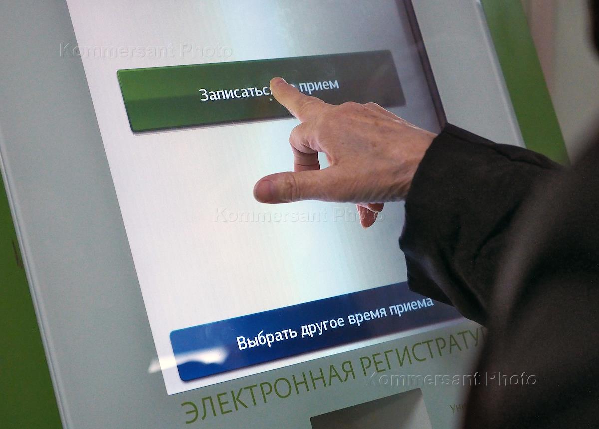 Городская поликлиника N6. Жанровая фотография. Посетители с полисом обязательного медицинского страхования записываются на прием к врачу через терминал.