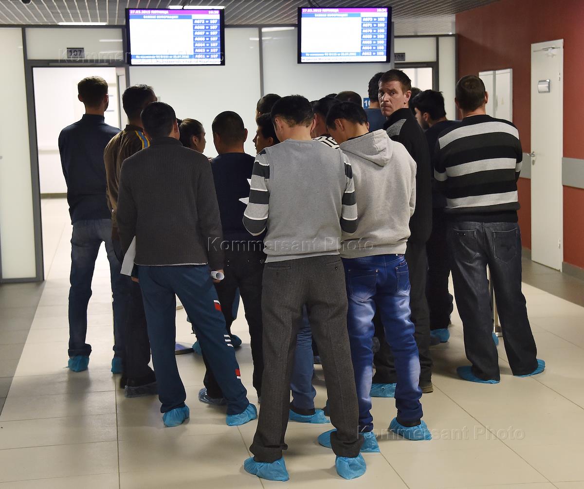 Единый миграционный центр по Московской области в поселке Путилково. Мигранты в здании центра.