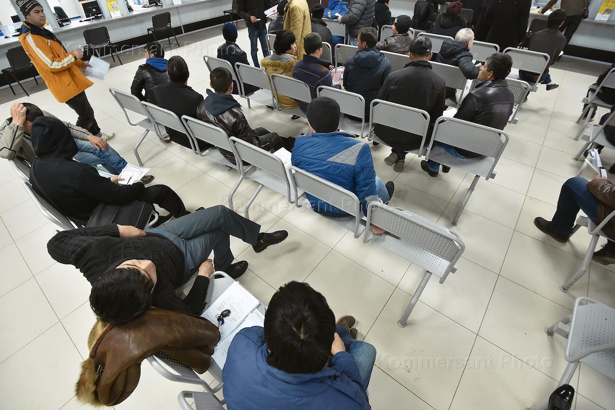 Единый миграционный центр по Московской области в поселке Путилково. Мигранты во время оформления на сдачу документов.
