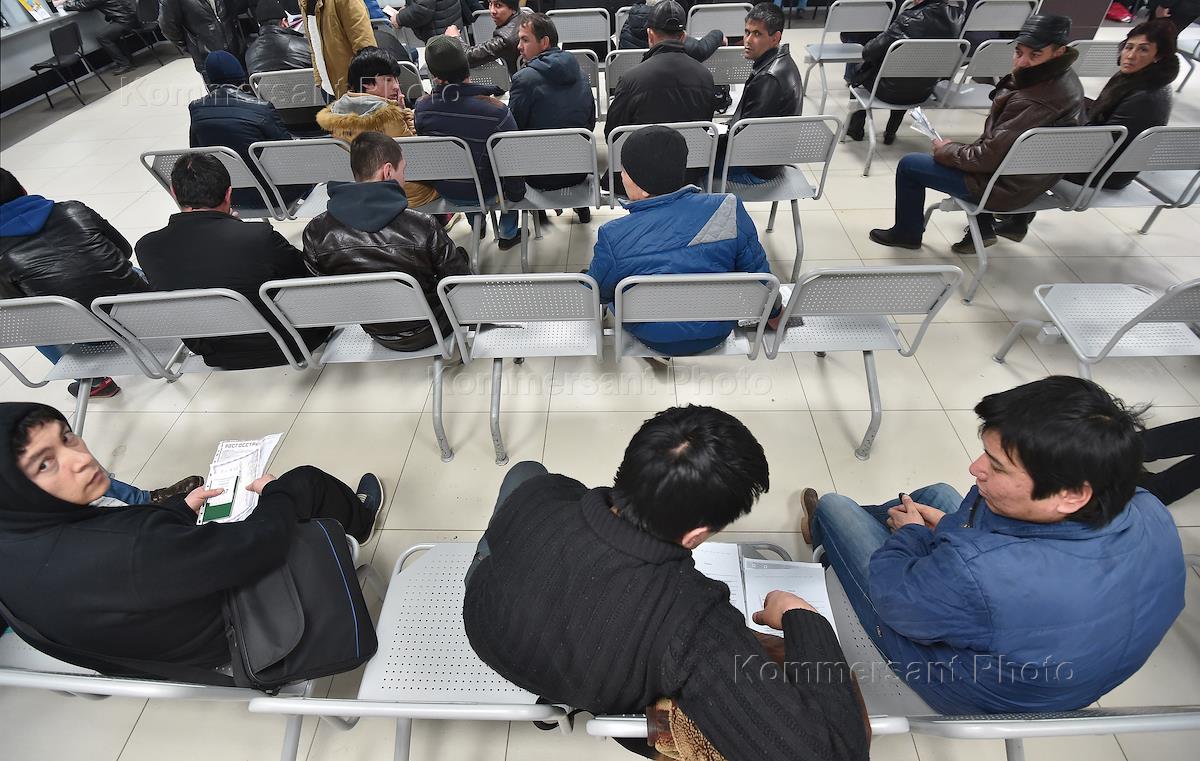 Единый миграционный центр по Московской области в поселке Путилково. Мигранты во время оформления на сдачу документов.