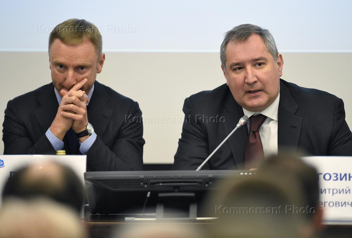 Заместитель председателя правительства России Дмитрий Рогозин (слева) и министр образования и науки России Дмитрий Ливанов (справа) во время открытия общероссийского форума "Новые кадры ОПК: союз образования и промышленности", который проходит в учебном центре ОАО "Туполев".