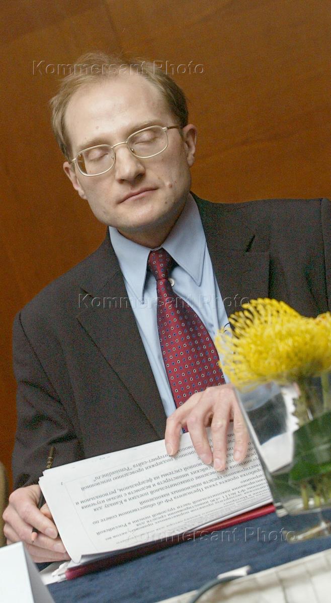 Member of the State Duma 'Union of the Right Forces' (SPS) faction, vice chairman of the legislature's Creditors and Financial Markets Committee Nikoilay Brusnikin takes part in the conference headlined 'Pension Reforms in Russia'. The conference was held in the Ararat Part-Hyat Hotel.