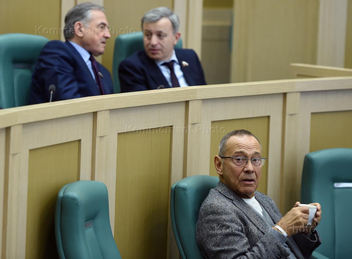 Заседание Совета Федерации (СФ) России. Режиссер Андрей Кончаловский (за трибуной), слева направо: заместители председателя СФ России Ильяс Умаханов, Евгений Бушмиин, председатель СФ России Валентина Матвиенко, заместители председателя СФ России Юрий Воробьев и Галина Карелова во время заседания.