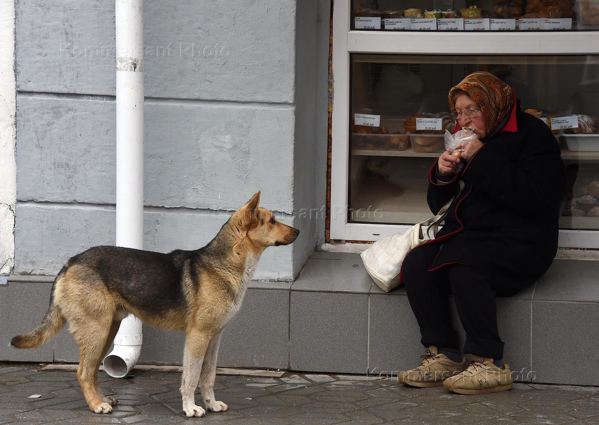 Жанровая фотография. Пожилая женщина ест у витрины хлебного ларька.