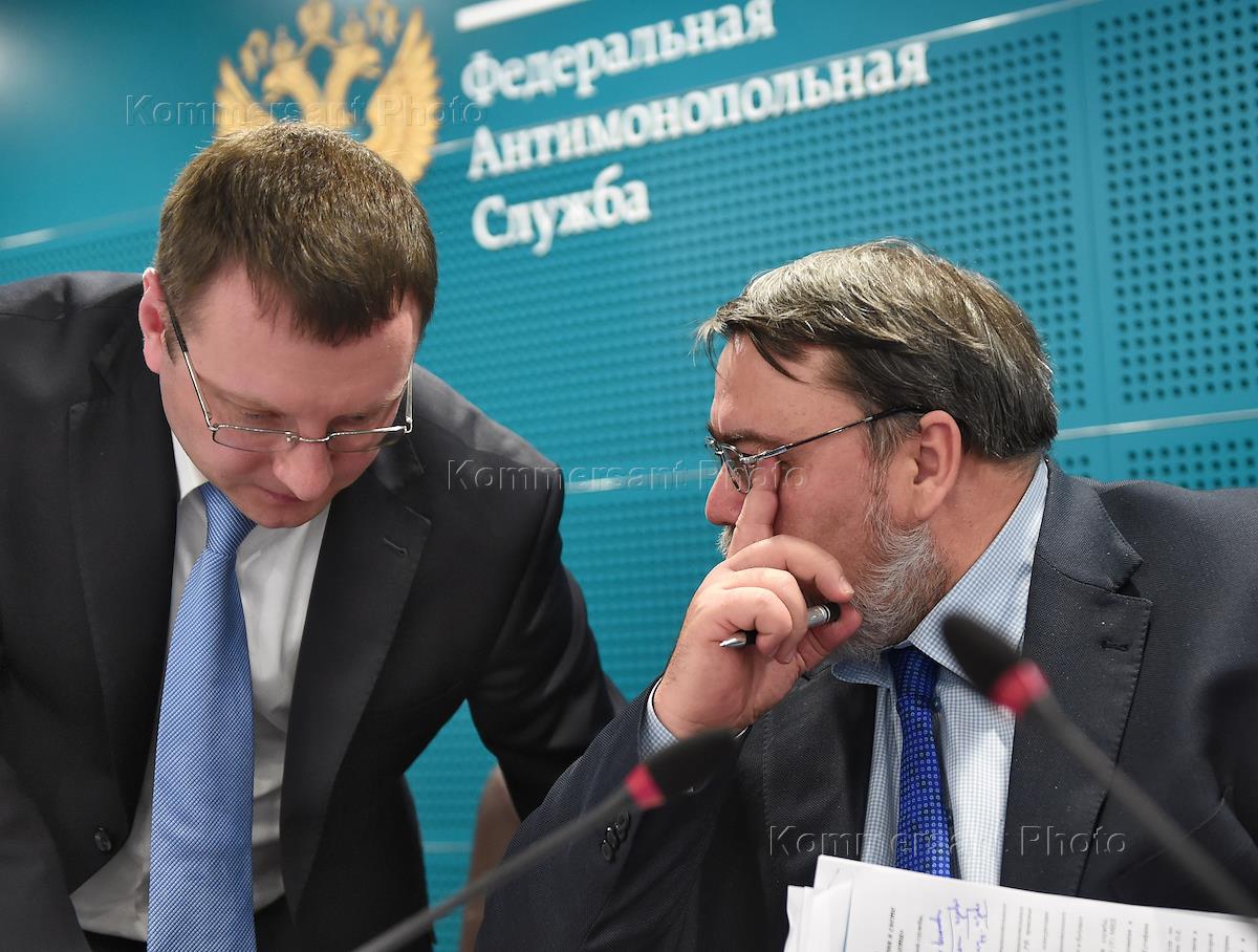 Начальник Правового Управления Федеральной антимонопольной службы (ФАС) России Сергей Пузыревский (слева) и руководитель Федеральной антимонопольной службы России Игорь Артемьев на конференции "Развитие антимонопольного законодательства в свете принятия четвертого антимонопольного пакета" в Федеральной антимонопольной службе (ФАС) России.