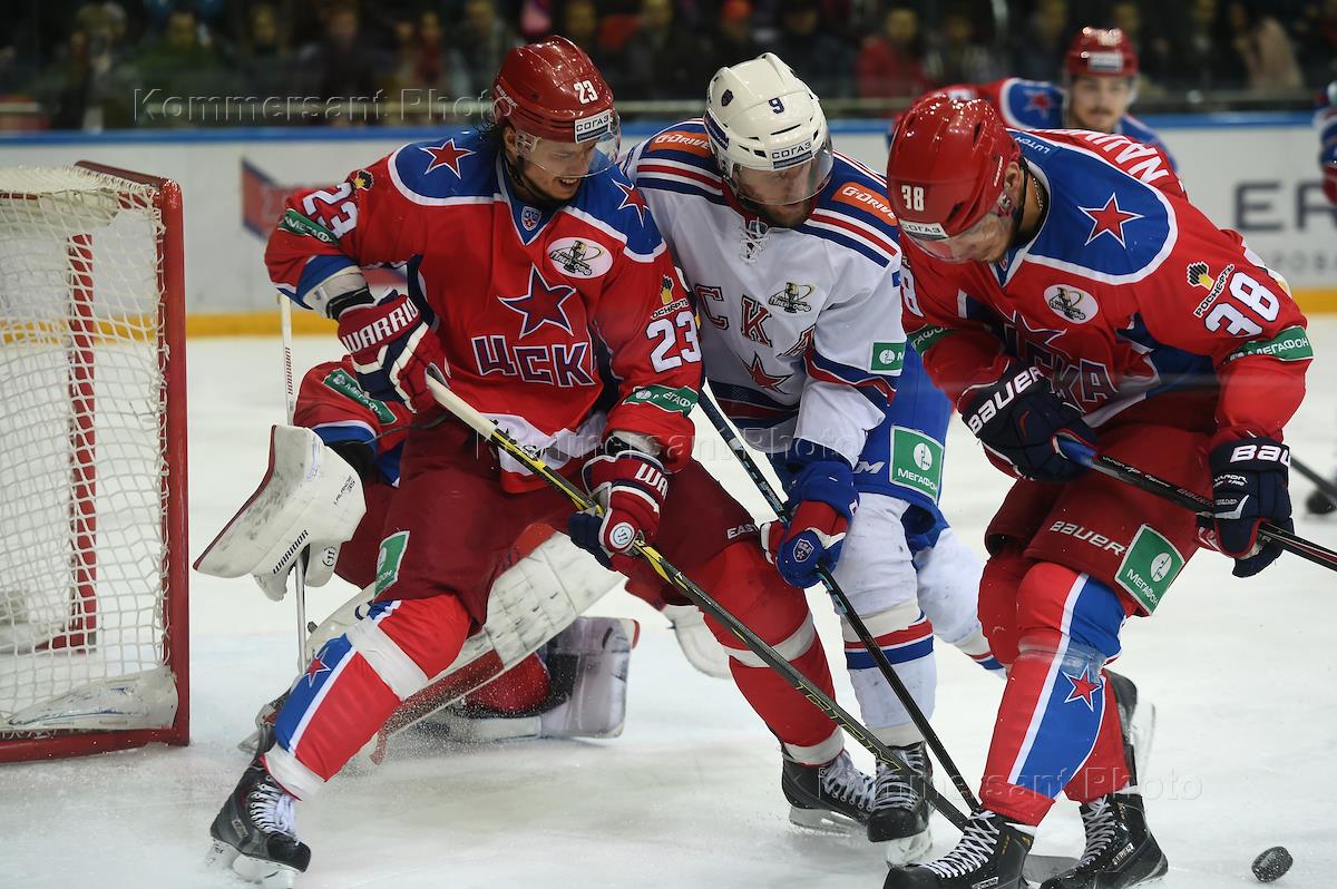 Continental Hockey League. Semi-Final. play off of Gagarin Cup. The match between teams CSKA (Moscow) and SKA (Saint-Petersburg) held in the CSKA Ice Palace. Hockey-players Vladimir Zharkov (left) and Vadim Shipachyov (right) are during the match.