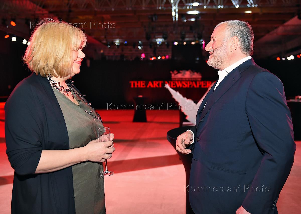 Главный редактор газеты The Art Newspaper Russia Милена Орлова (слева) и совладелец галерее "Триумф" Емельян Захаров (справа) на церемонии вручения III Ежегодной премии газеты The Art Newspaper Russia в ЦВЗ "Манеж".