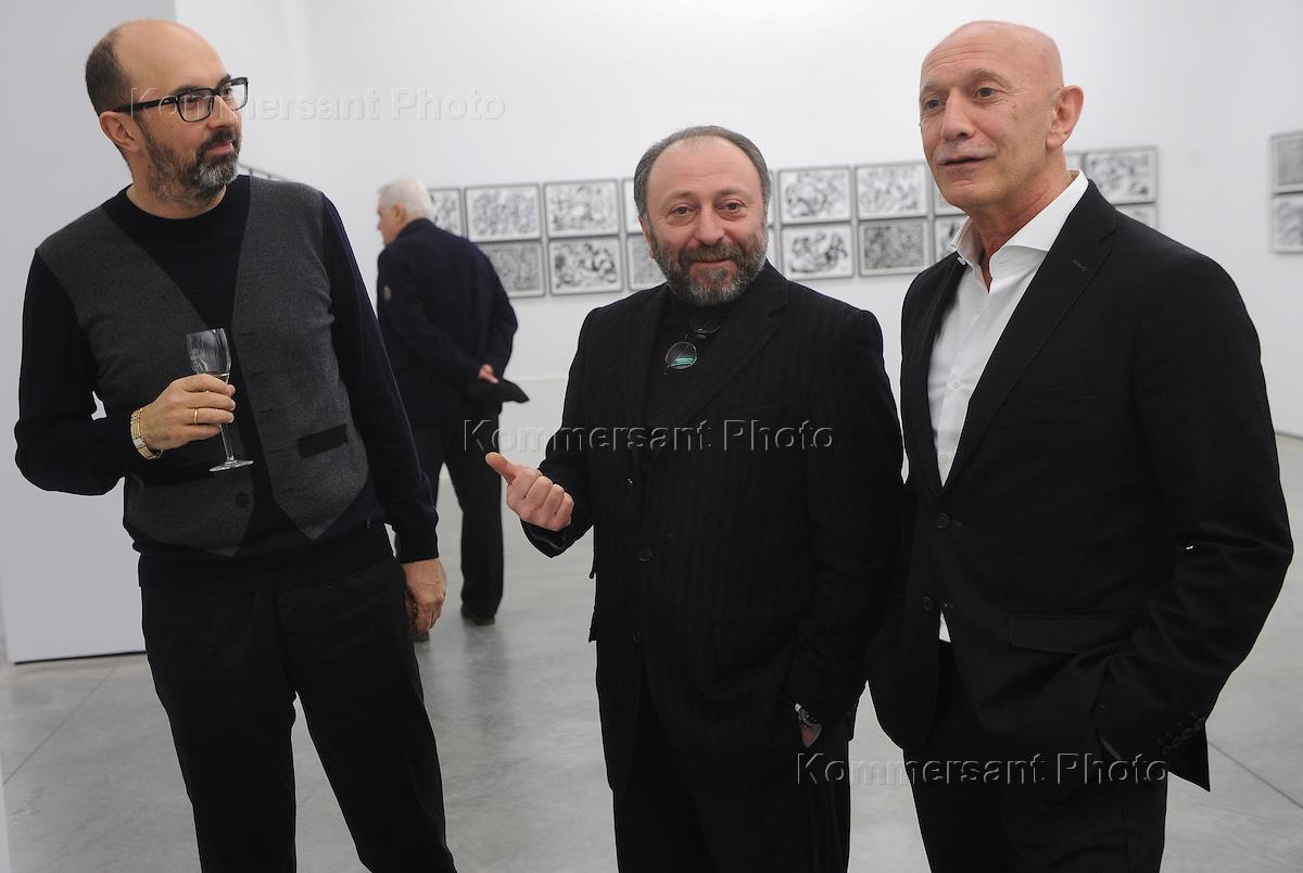 Gallery dealer Gari Tatintsyan (right) is at the ceremony of opening of the exhibition of painter Yevgeny Chubarov in his gallery.