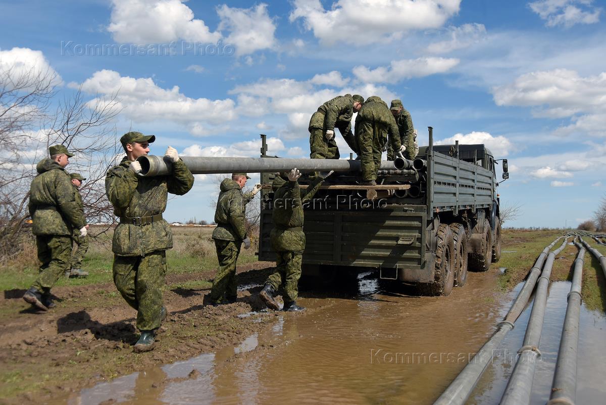 Военнослужащие трубопроводных войск Вооруженных сил России во время работ по восстановлению водоснабжения в селе Зоркино Нижнегорского района.