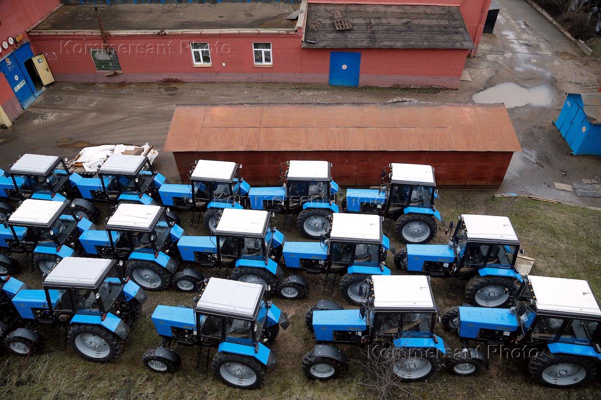 Жанровая фотография. Минский тракторный завод (МТЗ). Тракторы - готовая продукция - на стоянке на территории предприятия.