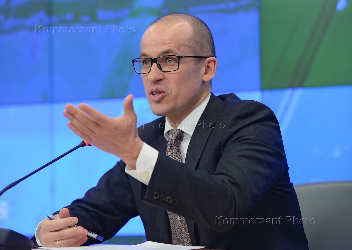 Министр России по связям с Открытым правительством Михаил Абызов во время пресс-конференции об определении нового порядка формирования и полномочий общественных советов при федеральных органах исполнительной власти. Пресс-конференция прошла в МИА "Россия сегодня".