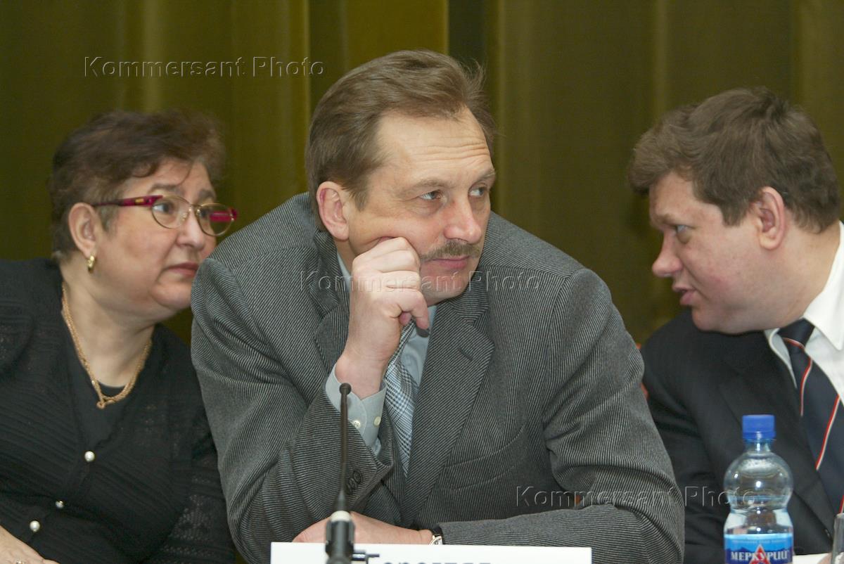Russian Deputy Finance Minister Bella Zlatkis (left), chairman of the Federation Council (FC - upper house of parliament) Budget Committee Yevgeny Bushmin (centre), and deputy chief of the Altay Kray administration Vladimir Germanenko (right) attend the FC hearings of the federal, regional and local administrations bonds market and its repercussions on the economic growth.