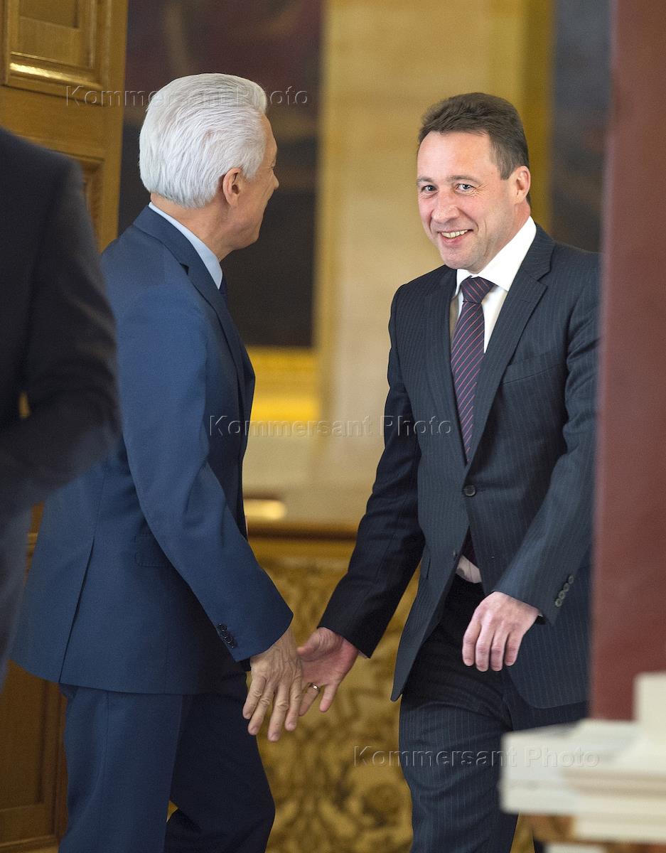 Председатель Государственной думы России Сергей Нарышкин (слева) и мэр Москвы Сергей Собянин (справа) перед началом заседания Государственного совета России, посвященному комплексу мер по развитию малого и среднего предпринимательства. Заседание прошло в Кремле.