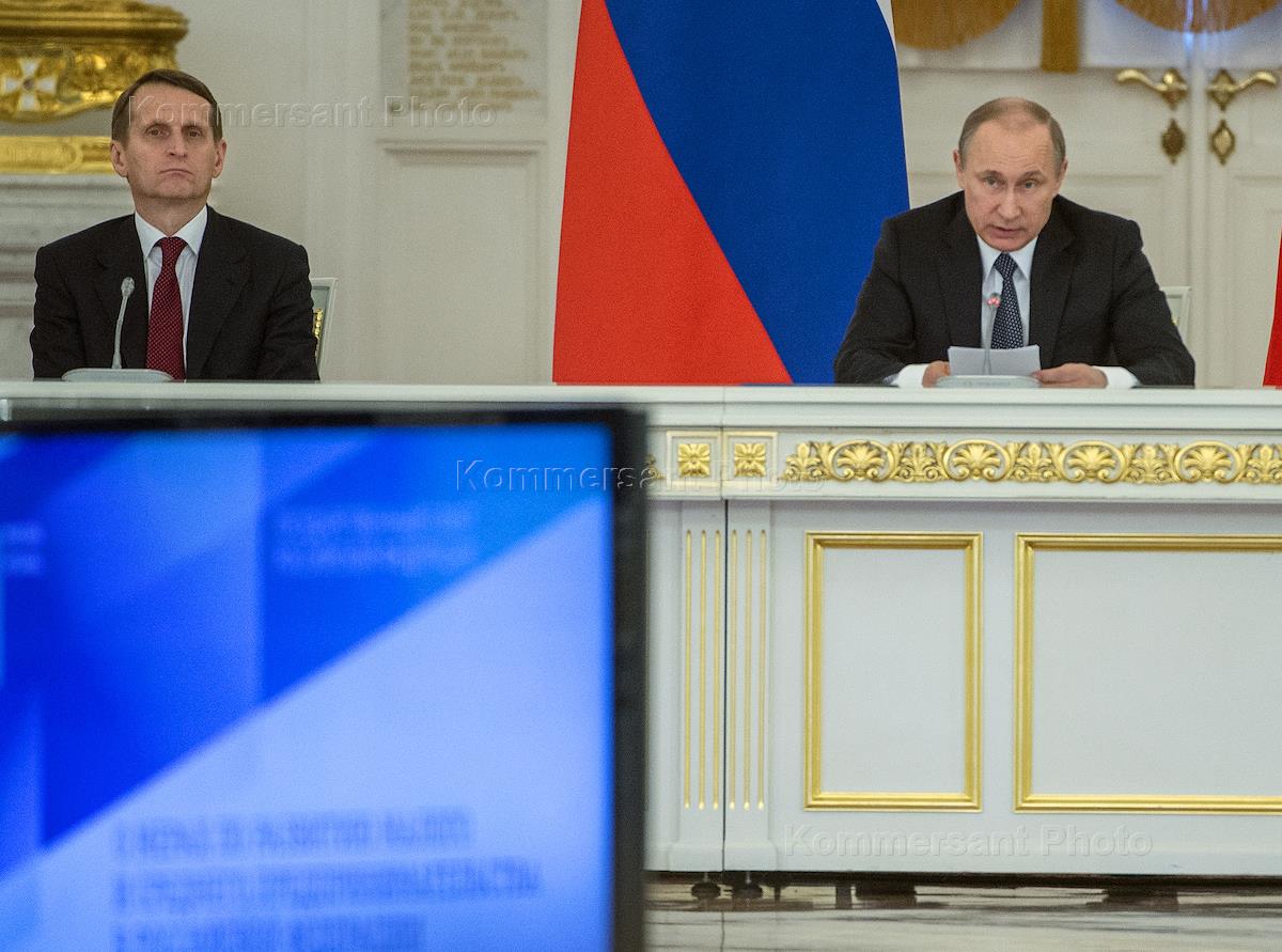 Председатель Государственной думы России Сергей Нарышкин (слева) и президент России Владимир Путин (справа) во время заседание Государственного совета России в Кремле.