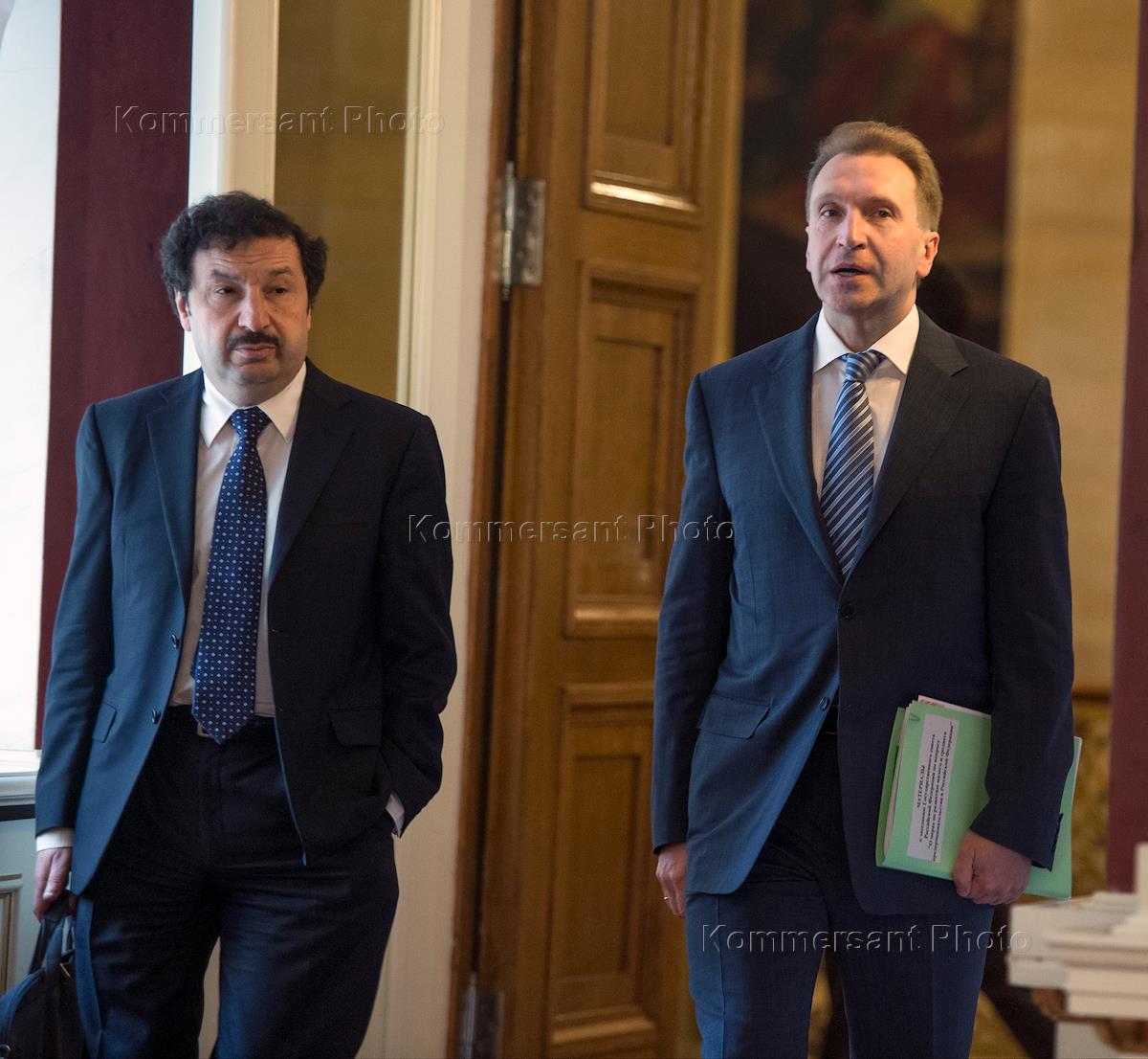 Ректор Российской академии народного хозяйства и государственной службы РАНХиГС при президенте России Владимир Мау (слева) и первый заместитель председателя правительства РОссии Игорь Шувалов (справа) перед началом заседания Государственного совета России, посвященному комплексу мер по развитию малого и среднего предпринимательства. Заседание прошло в Кремле.
