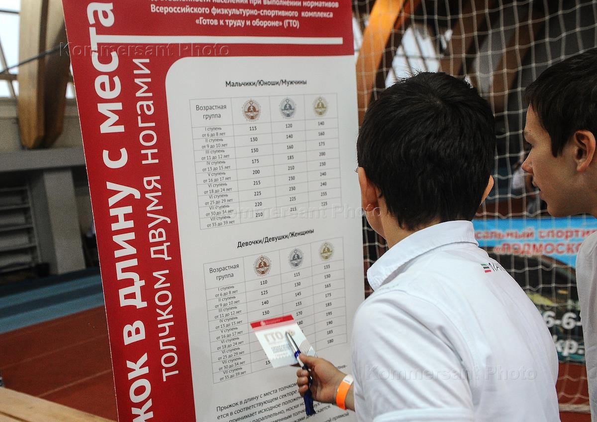 Single day of GTO (Ready for Labour and Defense) standards testing among students of secondary schools of all municipal districts of Moscow region. Testing held at 'Podmoskovye' Universal Sports Complex.