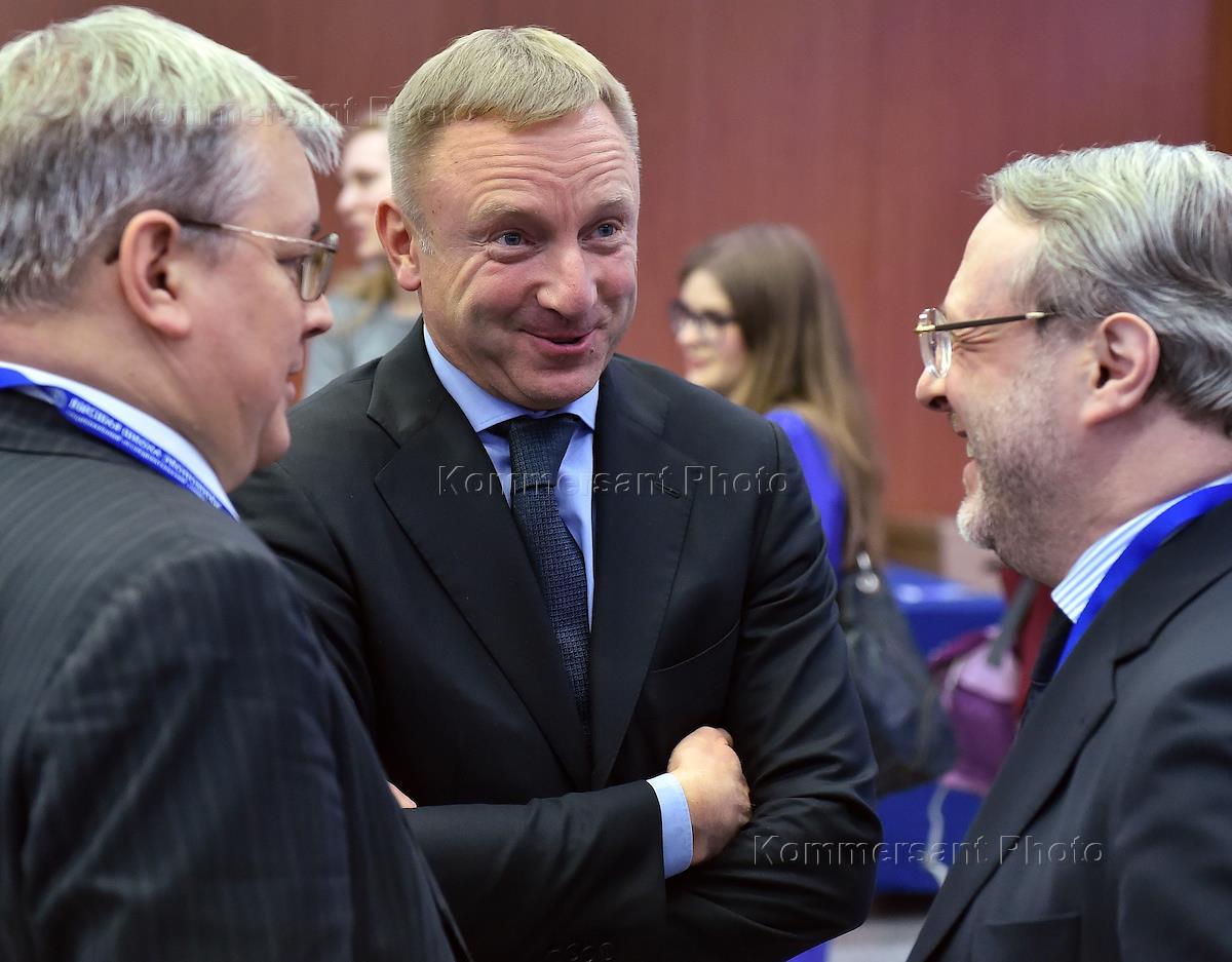 XVI Апрельская международная научная конференция по проблемам развития экономики и общества. Заседание сессии "Пути развития профессионального и высшего образования в условиях экономической турбулентности". Ректор Государственного университета - Высшей Школы Экономики Ярослав Кузьминов (слева) и министр образования и науки России Дмитрий Ливанов (в центре) в перерыве заседания в Центре международной торговли (ЦМТ).
