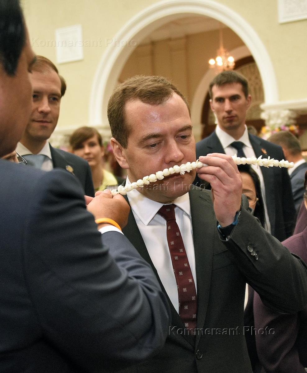 Рабочая поездка председателя правительства России Дитрия Медведева в Таиланд. Председатель правительства России Дмитрий Медведев после церемонии подписания документов по итогам российско-таиландских переговоров в Бангкоке.