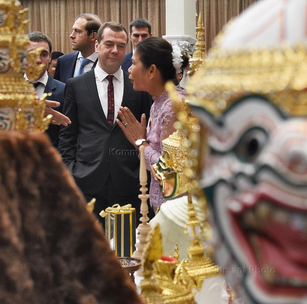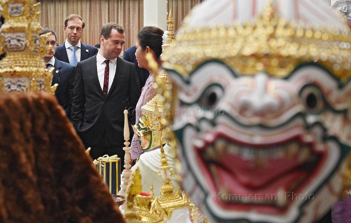 Рабочая поездка председателя правительства России Дитрия Медведева в Таиланд. Председатель правительства России Дмитрий Медведев (слева) после церемонии подписания документов по итогам российско-таиландских переговоров в Бангкоке.