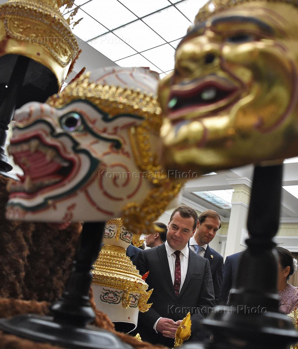 Рабочая поездка председателя правительства России Дитрия Медведева в Таиланд. Председатель правительства России Дмитрий Медведев (слева) и министр промышленности и торговли России Денис Мантуров (справа) после церемонии подписания документов по итогам российско-таиландских переговоров в Бангкоке.