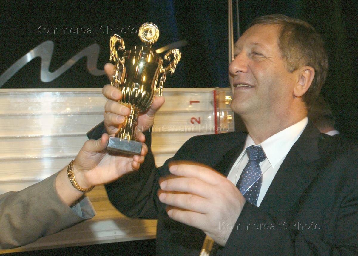 Leader of the Russian Economic Liberty Party (PES) Konstantin Borovoy holds up the Moscow Cockroach Race Cup at the cockroach races held in the Mirage Club.